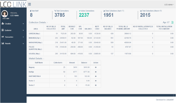 LCO Link having its major functionalities in its web application, for to manage all office level operations. It will get all detail lively fro Mobile app. Based on collection detail generate reports for MSO payment detail, current month growth chart and other reports.
